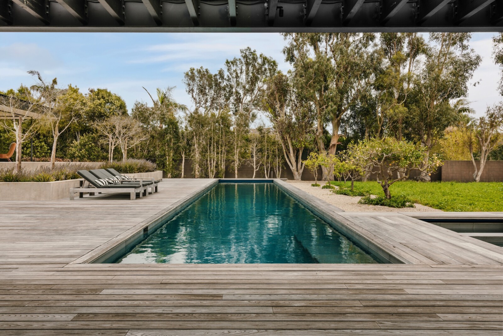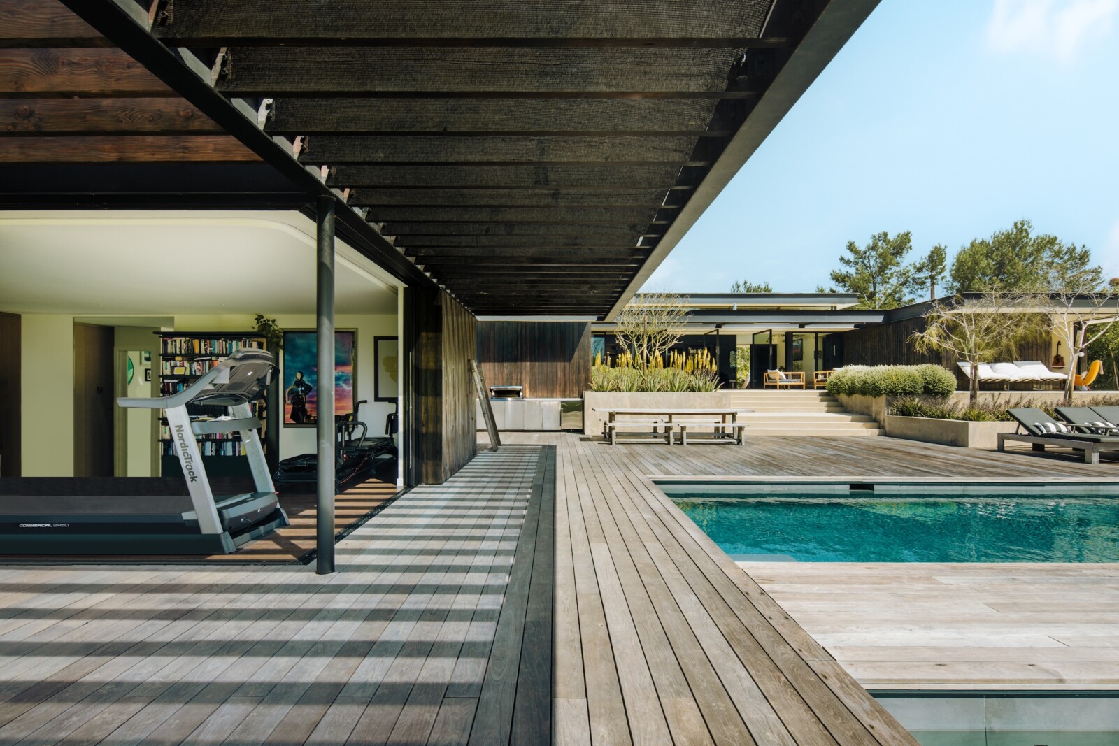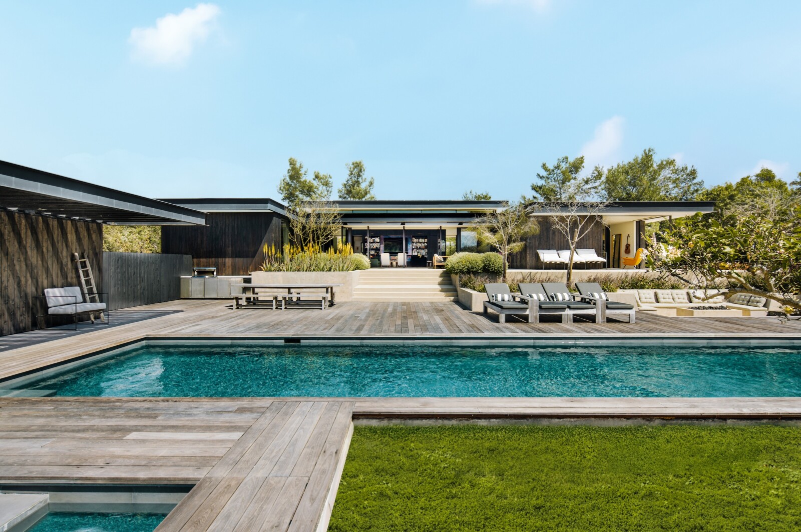 The former garage was transformed into an open-air gym that welcomes sunlight and ocean breezes, while a regulation lap pool anchors the outdoor space and defines the home’s central axis. The interiors embrace views of the surrounding verdant landscape, while a flexible plan encourages easy entertaining while protecting privacy.